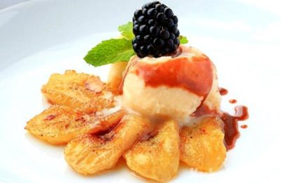 Foneu 1/3 de la mantega a foc mitjà i, a continuació, afegiu-hi el sucre de canya i el vinagre. Escalfeu l'almívar, remenant constantment, per dissoldre el sucre. Aboqueu una petita quantitat de la barreja en una paella untada amb oli. Talleu la fruita a daus, poseu-la a la paella i aboqueu-hi la salsa preparada.